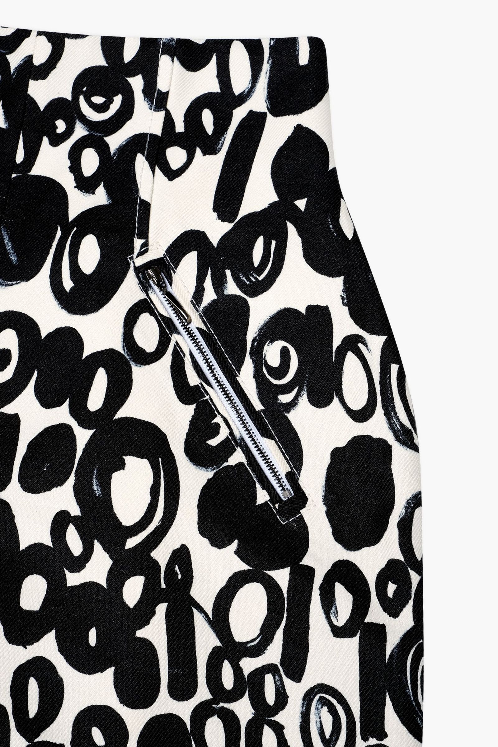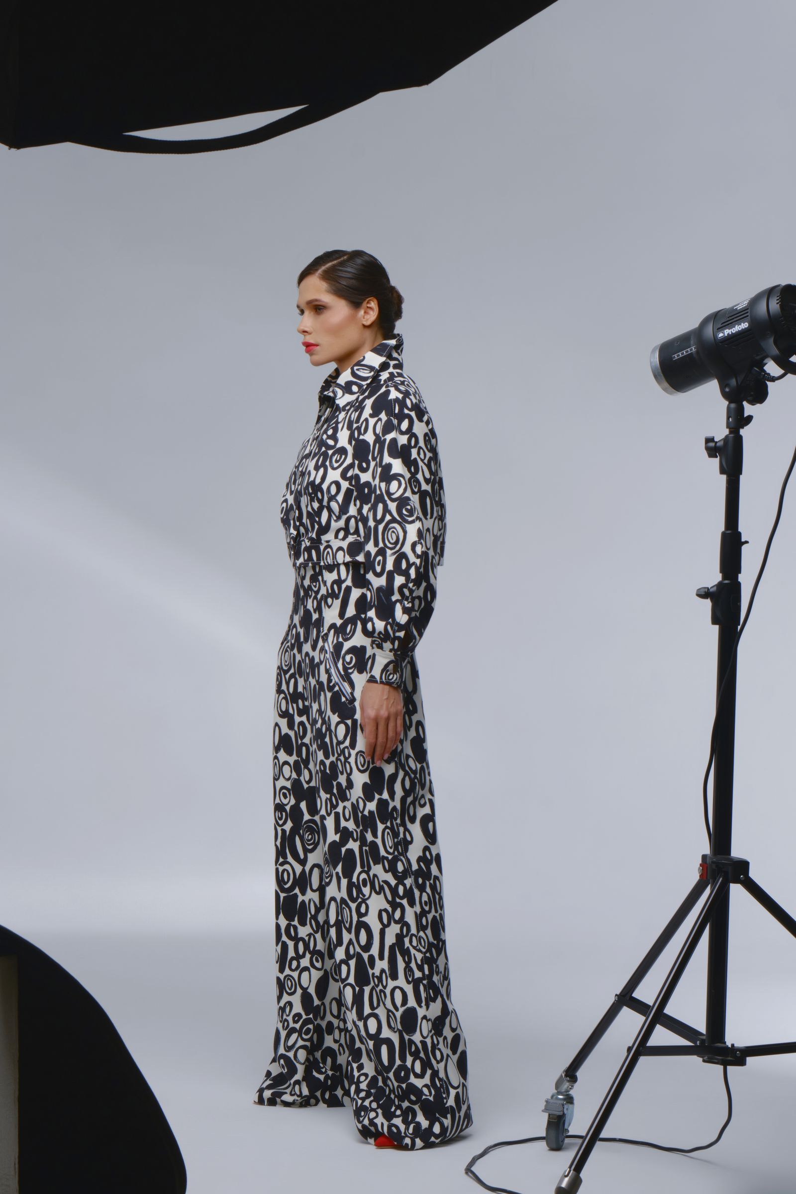 Объемные длинные puddle-брюки с выразительным принтом на итальянском хлопке с шерстью отлично сочетаются с жакетом-курткой с акцентной линией рукава реглан.